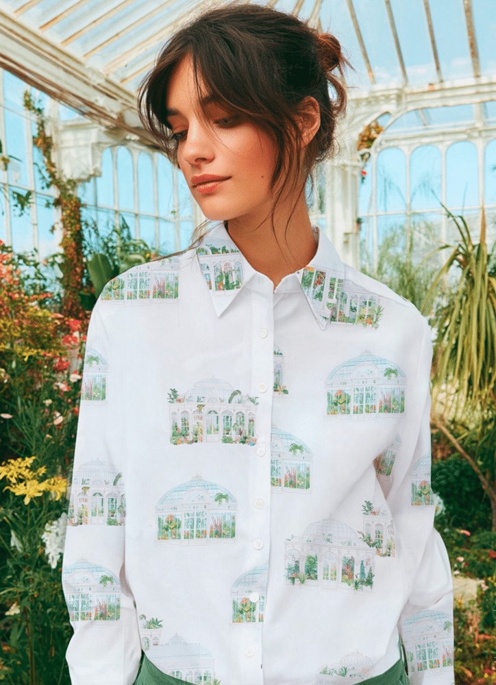 Camisa en color blanco con estampado de invernaderos. Cuello camisero, cierre frontal con botones y manga larga. Bajo redondeado.