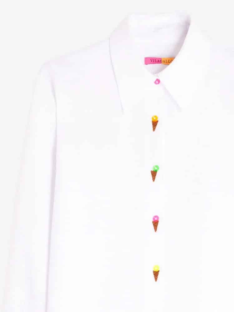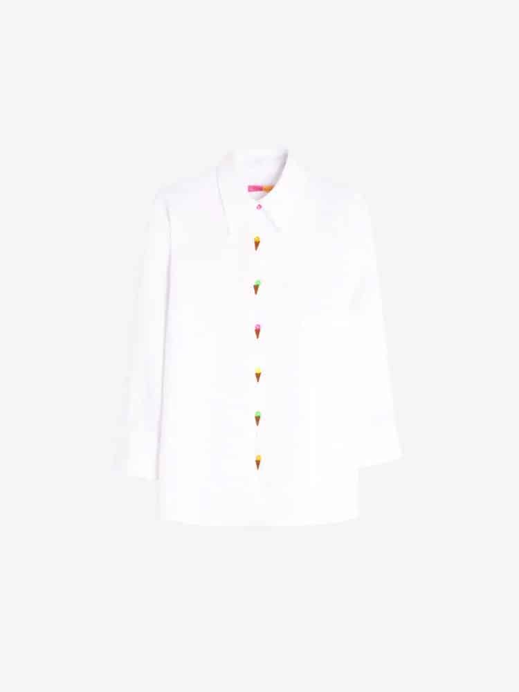 Camisa blanca de corte recto con detalle de helados bordados a lo largo de la botonadura frontal. Cuello clásico y manga 3/4.