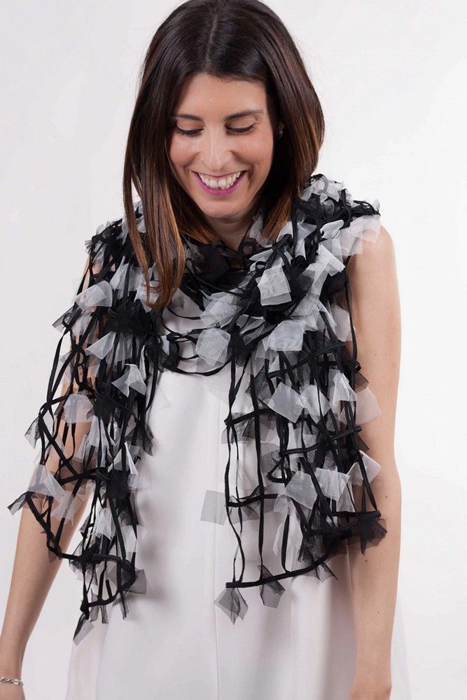 Original chal de fiesta de amplia rejilla con aplicaciones de tul en el mismo color.