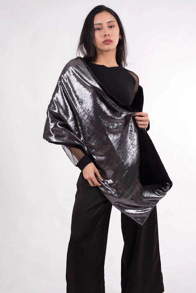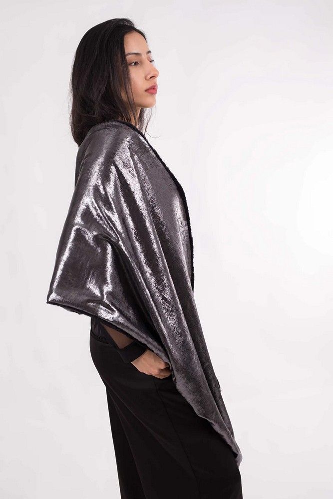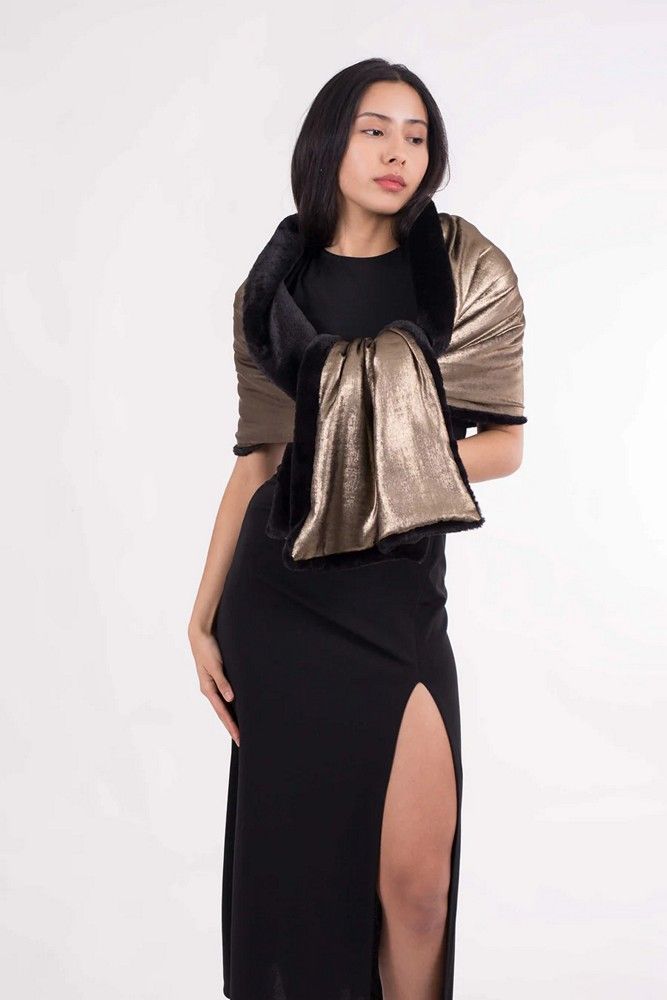 Chal mujer eclipse cálido. Este chal de fiesta Eclipse cálido combina sofisticación y comodidad para eventos de invierno. Por un lado, presenta un ecopelo negro suave y agradable al tacto que aporta calidez; por el otro, un tejido dorado o plateado que añade un toque elegante y brillante, ideal para bodas y celebraciones. Su diseño reversible permite adaptarse a diferentes estilos, garantizando un complemento versátil y distinguido para tus looks más especiales.