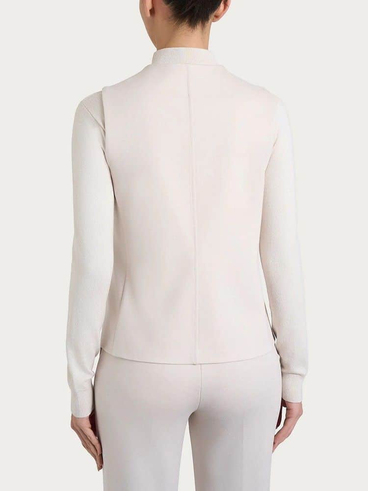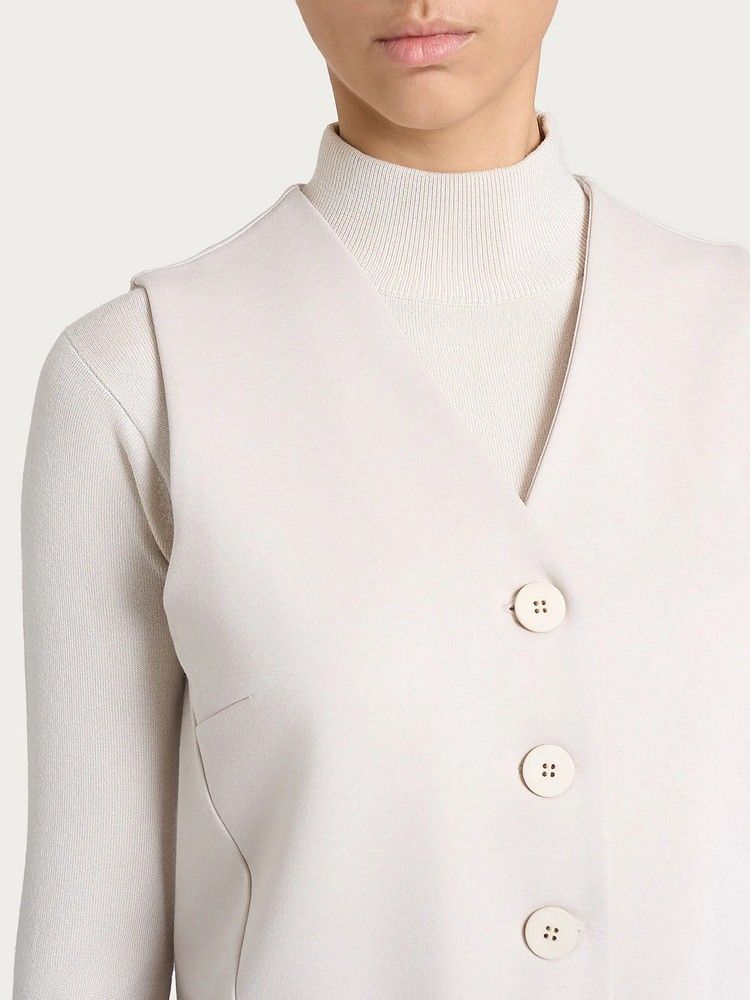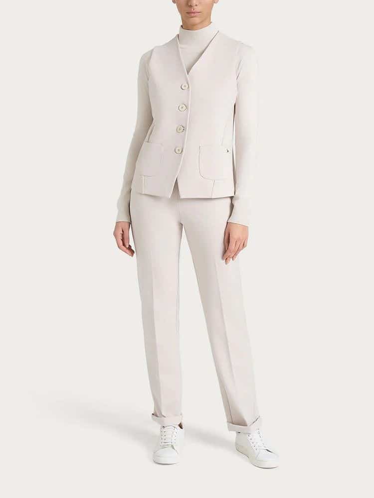 Definido por un cierre frontal de cuatro botones que realza su carácter clásico y refinado, se puede usar sobre un suéter ligero o incluso solo.