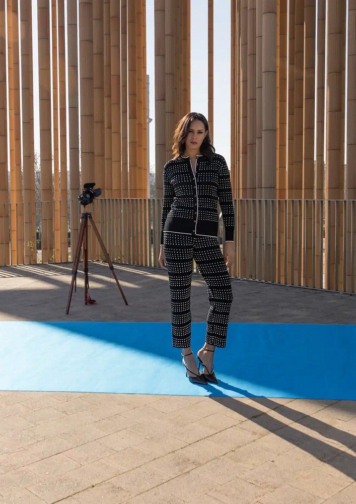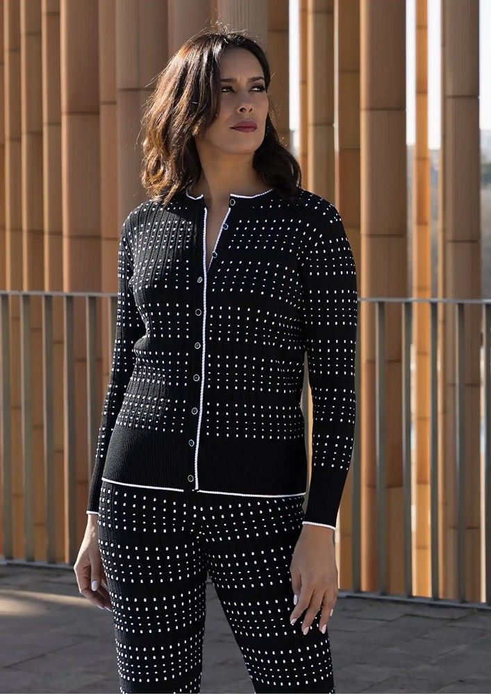 Chaqueta mujer Jacquard Binomio. Confeccionada en un jacquard bicolor que alterna negro y blanco en un patrón geométrico de pequeños cuadrados, esta prenda destaca por su elegancia gráfica y su capacidad de adaptación a múltiples estilos. Su estructura permite llevarla como jersey cerrado, creando una silueta pulida y sofisticada, o como chaqueta abierta, ideal para combinar con tops, blusas o camisetas básicas. Los botones esmaltados en negro, delicadamente ribeteados en plateado, aportan un toque de distinción y brillo sutil que eleva el conjunto. Tricotado con hilaturas de viscosa de alta calidad, envuelve el cuerpo con comodidad sin perder la forma, convirtiéndola en una pieza clave para los días fríos.