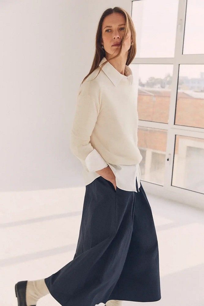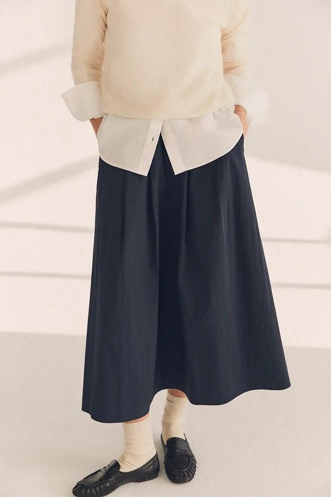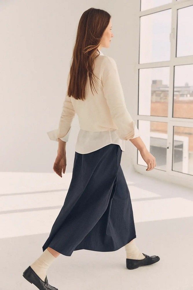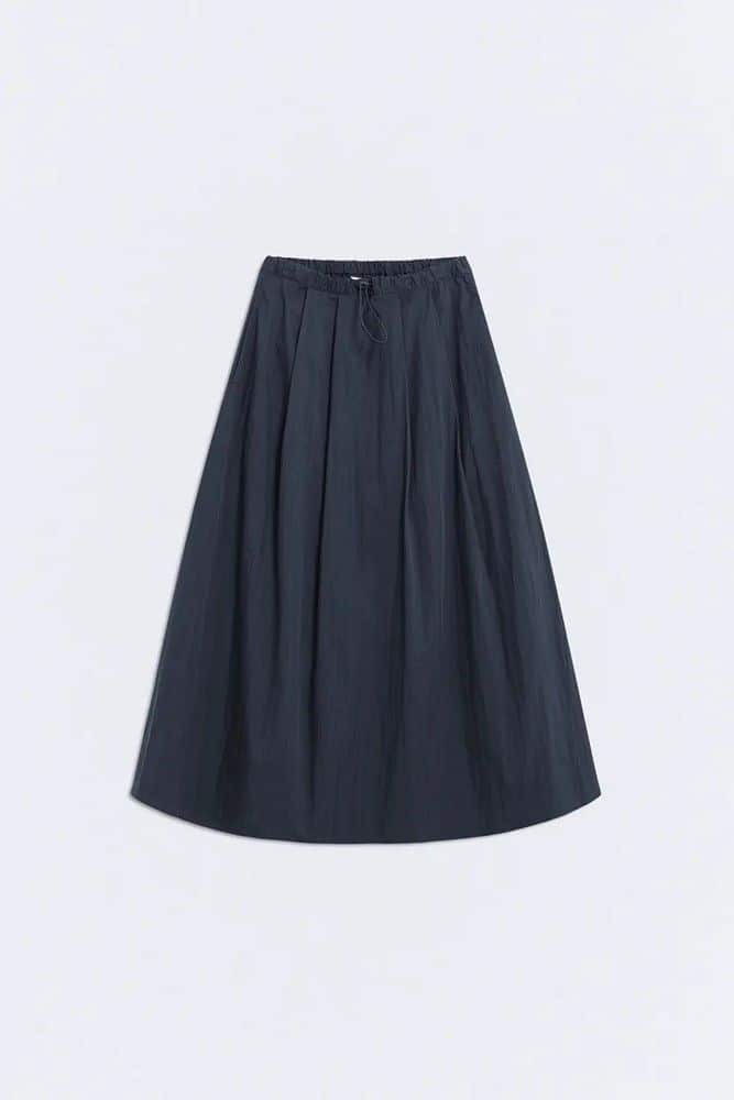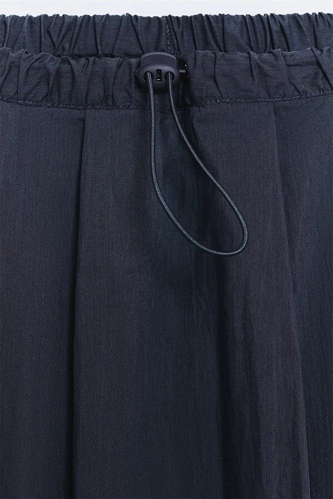 Falda mujer larga con bolsillos en color azul marino. Con mezcla de algodón BCI. Estilo abullonado con cintura fruncida. Goma en la cintura con ajustador.