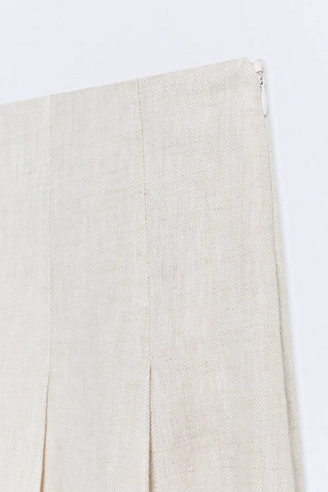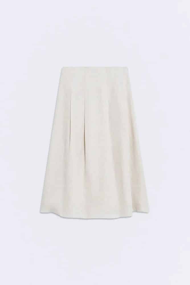 La falda Rania es una prenda de tablas confeccionada en twill de lino, que combina estructura y ligereza en color beige.