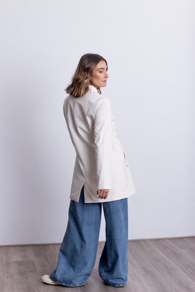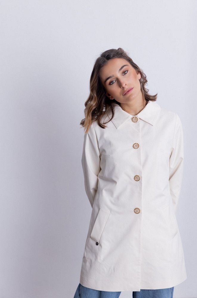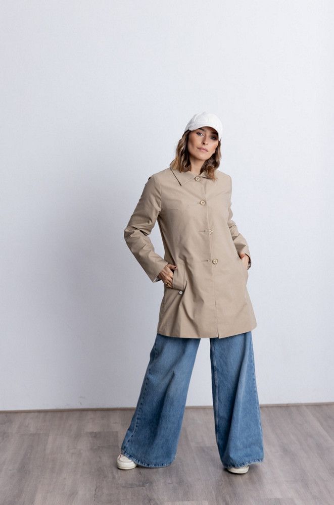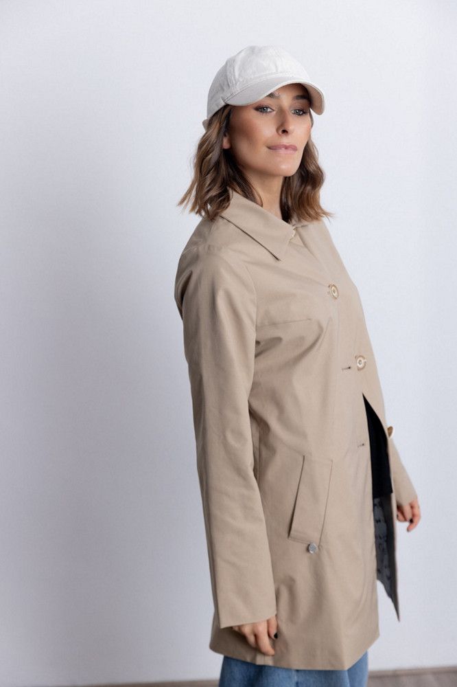 Gabardina mujer con bolsillos lisa. Confeccionada en un tejido rugoso. Largura media. Cuello con solapas. Bolsillos delanteros y cierre mediante botones. Forro personalizado.