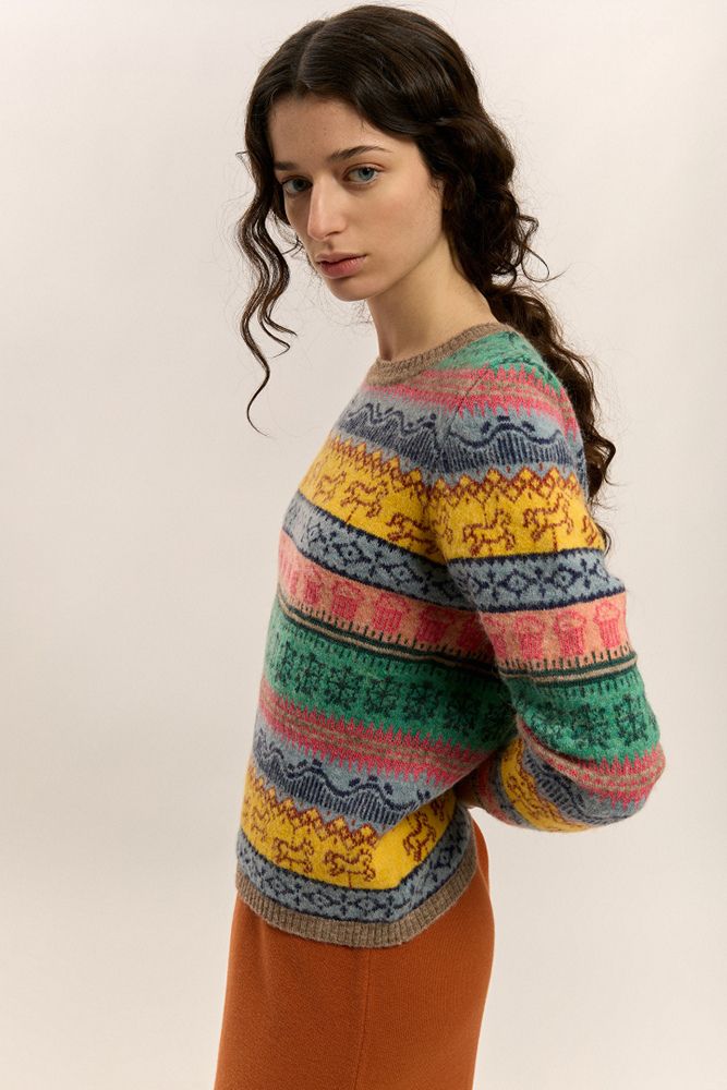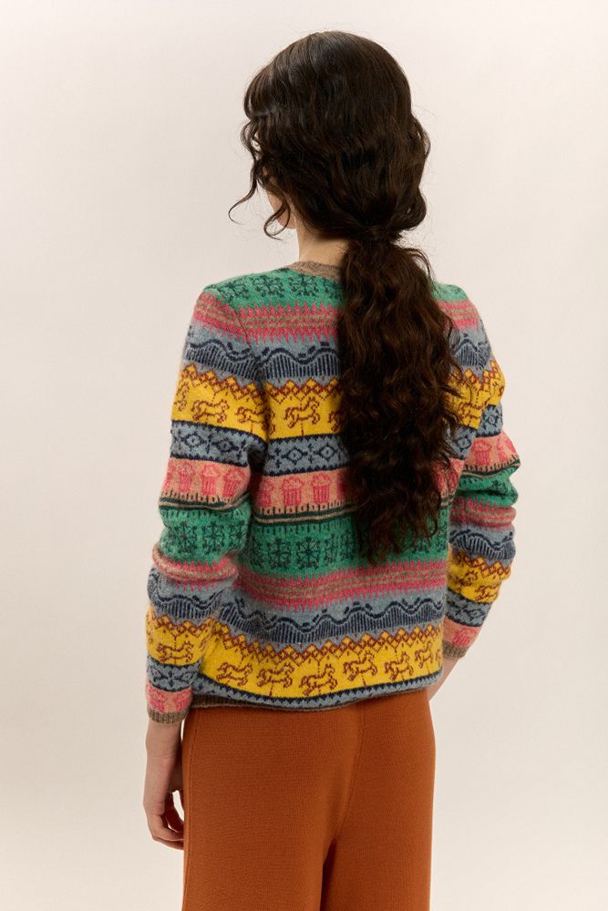 Jersey de punto de cuello redondo y manga pegada con jacquard de temática feria. Cuello, puños y bajos acanalados.