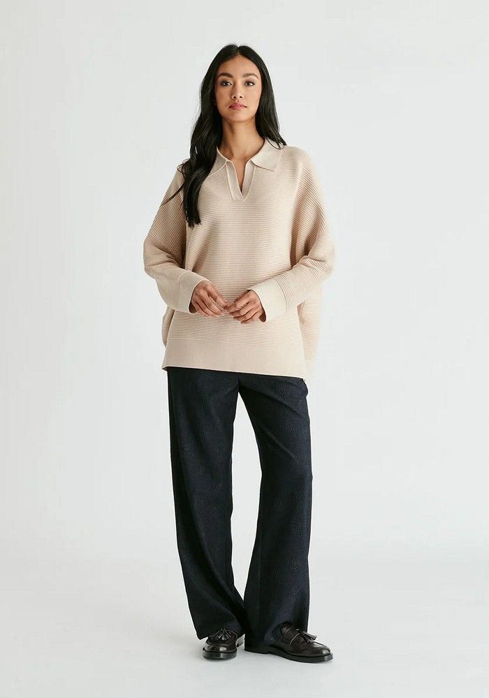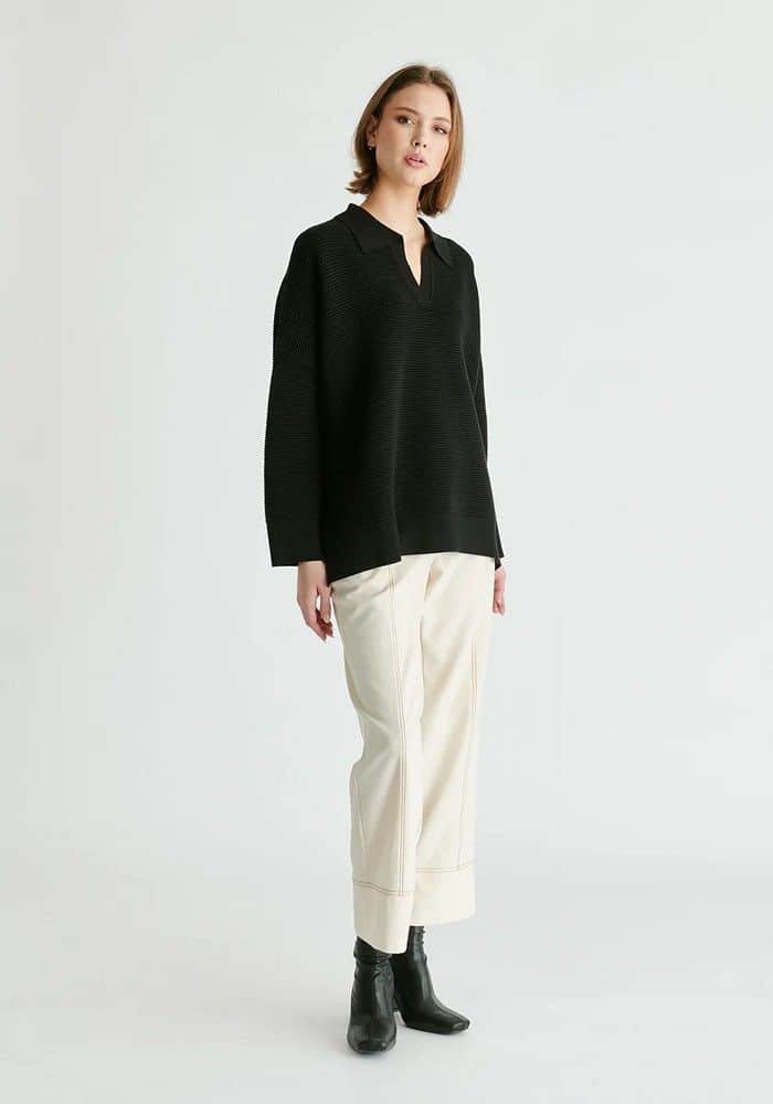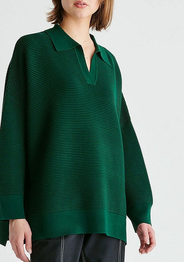 Jersey mujer cuello tipo polo canalé. Este jersey de canalé está confeccionado con una suave mezcla de viscosa, lo que le confiere un tacto lujoso y elástico. Presenta un cuello polo clásico y un cuerpo holgado y oversize con hombros caídos. Los puños estilizados están diseñados para ser cómodos y mantener su forma sin resultar ajustados. Este jersey versátil y favorecedor es una prenda esencial para un estilo informal y cotidiano, ideal para el cambio de estación.