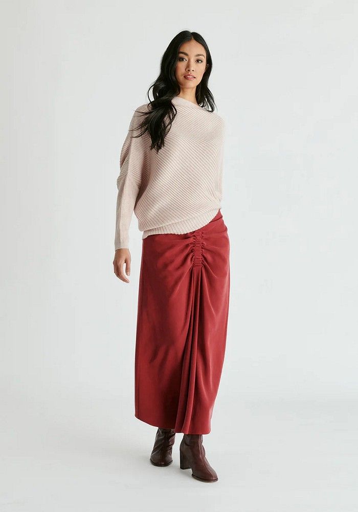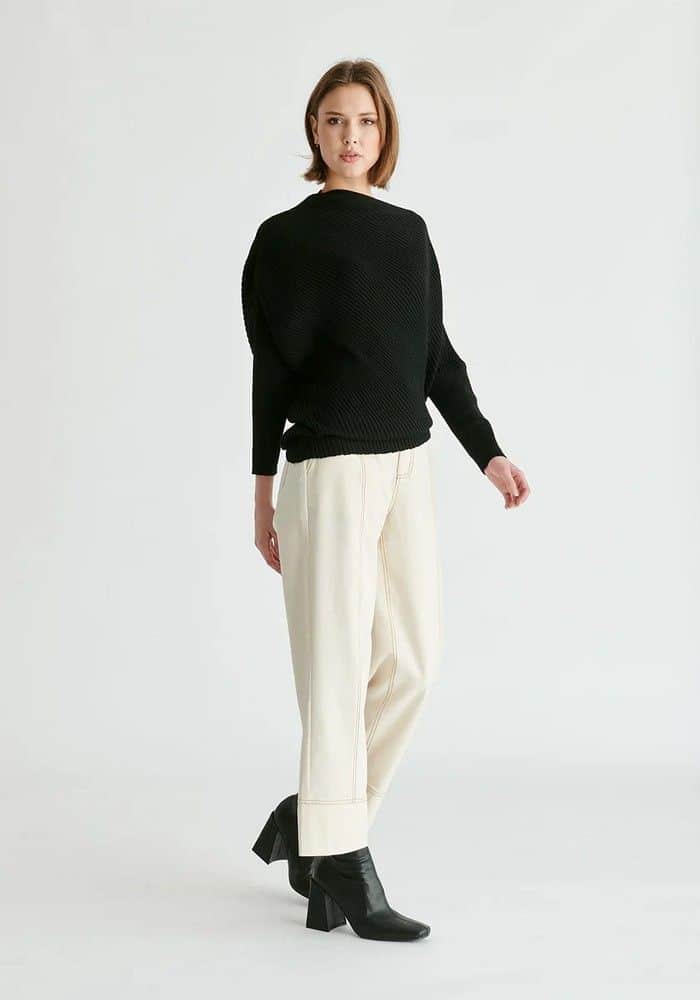 Jersey mujer de punto drapeado. Fluido y elegante, este jersey drapeado será tu favorito este invierno. Presenta un escote asimétrico y una cintura ajustada que se ciñe al cuerpo de forma favorecedora. Combínalo con pantalones ajustados y botas altas para un look casual.