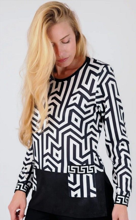 Suéter mujer con hombreras estampado geométrico con bolsillos delante.