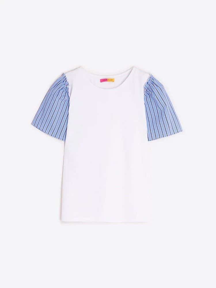 Top blanco de punto de manga corta. Manga de rayas azul y blanco. Cuello redondo y corte recto.