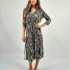 Vestido largo con escote cruzado, cinturón y manga 3/4 con precioso estampado Riad.
