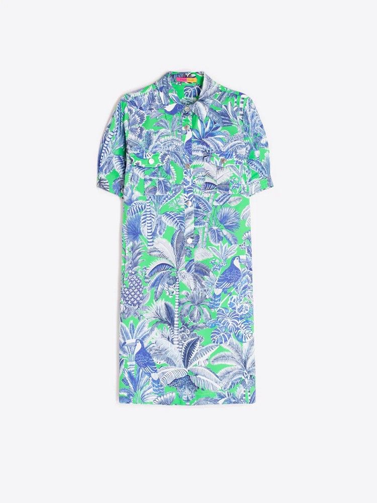 Vestido camisero corto con estampado tropical en tonos azules sobre fondo verde. Cuello camisero clásico y dos bolsillos en el pecho con solapa y botón decorativo.