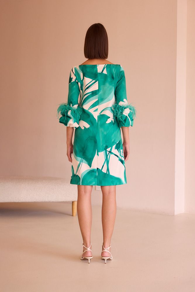 Vestido mujer de fiesta recto plumas en la manga.