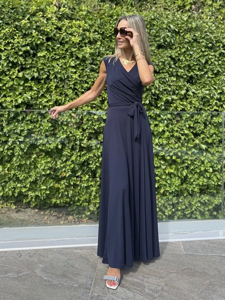 Vestido largo en azul marino, con escote cruzado, mini manga que cubre el hombro, cinturón en cintura de quita y pon y un vuelo de tela que hace que el vestido siente espectacular.