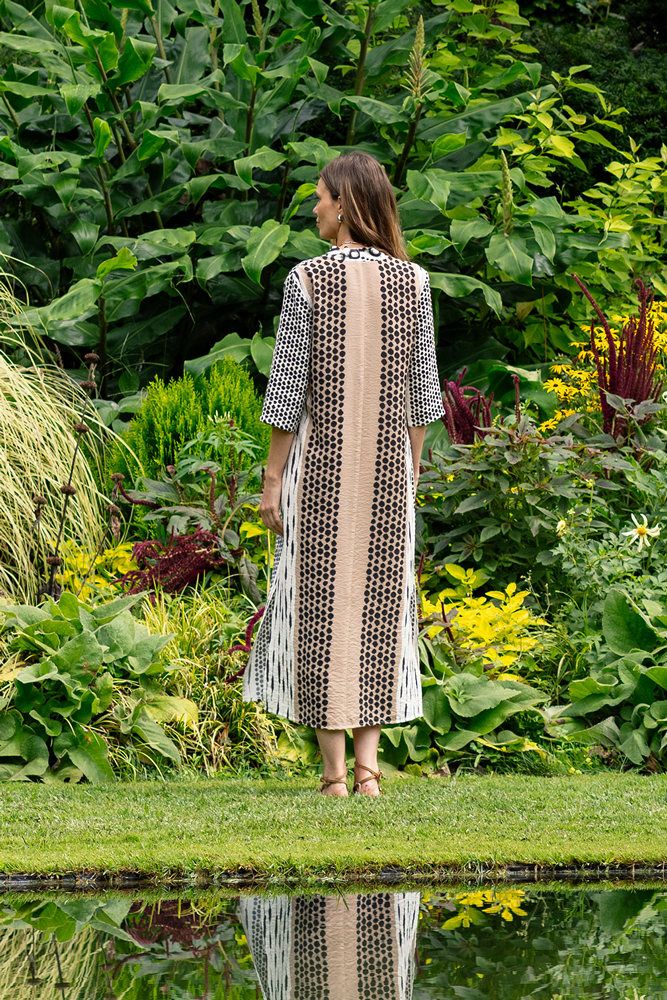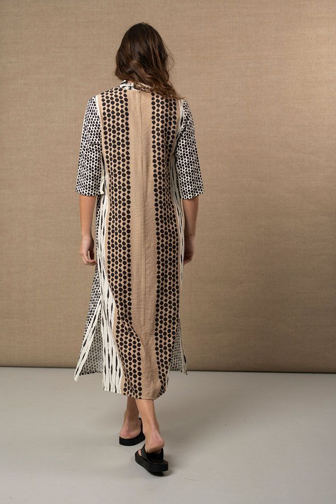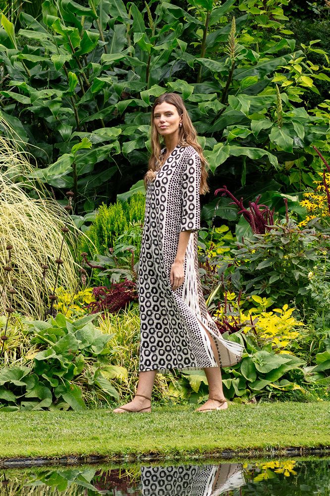 Este vestido largo combina un juego de estampados geométricos en contraste blanco y negro que aporta carácter sin perder sobriedad. Su escote en pico estiliza el cuello y el pecho, mientras que el corte recto acompaña el cuerpo con una caída fluida y cómoda, ideal para los días de calor o para looks relajados con un punto especial. El detalle del pequeño adorno tipo borla en el escote añade un toque artesanal y distintivo que eleva el diseño. Un vestido versátil que funciona tanto para paseos urbanos como para escapadas de verano, fácil de combinar con sandalias planas o alpargatas. Detalles que importan Largo midi. Escote en pico. Manga al codo. Estampado geométrico combinado. Detalle decorativo tipo borla en el escote. Tejido ligero y fluido.