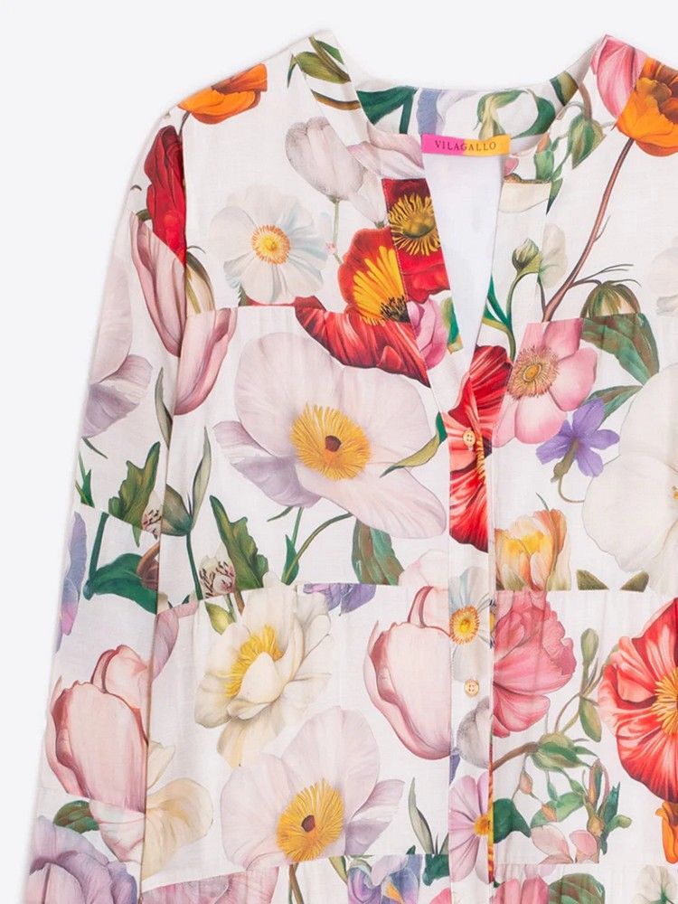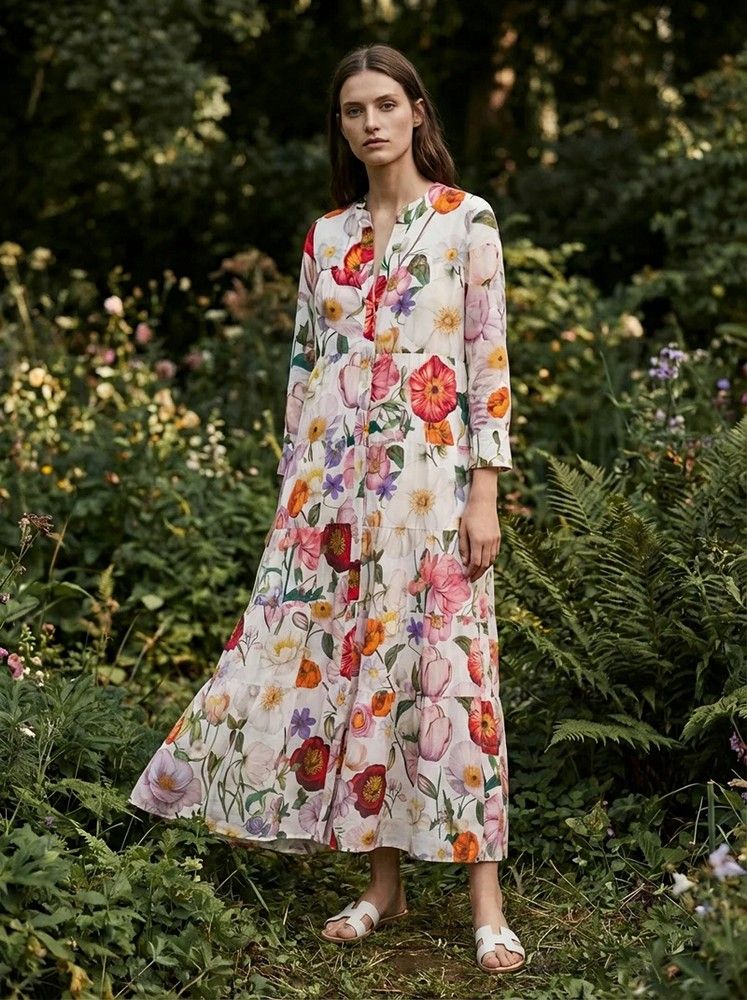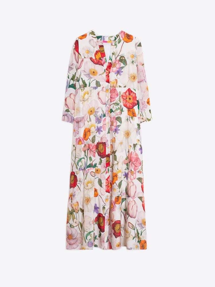 Vestido largo con estampado floral multicolor sobre fondo claro. Escote redondeado con abertura en pico y cierre de botones. Manga larga y cortes horizontales.