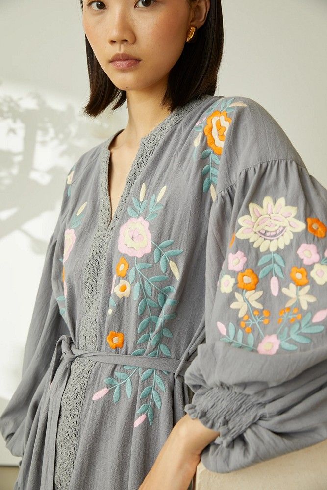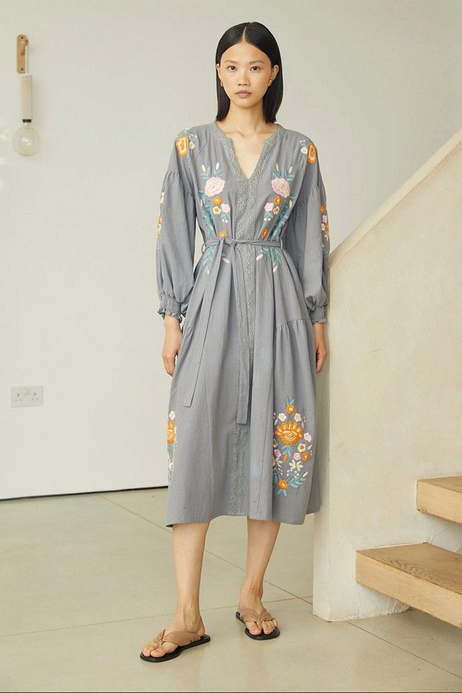 Este elegante vestido 100% algodón combina comodidad con un encanto discreto. Confeccionado en un tejido ligero y transpirable, presenta una silueta relajada de largo midi que cae con fluidez para un uso cómodo. El suave tono gris se realza con delicados bordados florales de colores vivos a lo largo del corpiño, las mangas y el bajo, añadiendo un sutil toque artesanal.