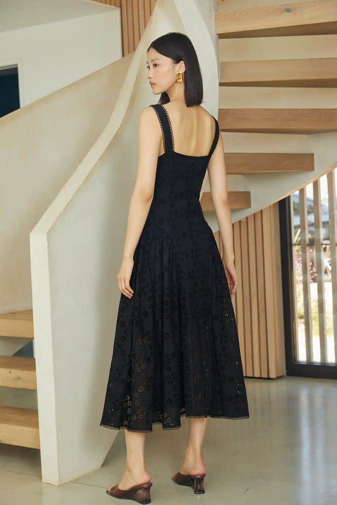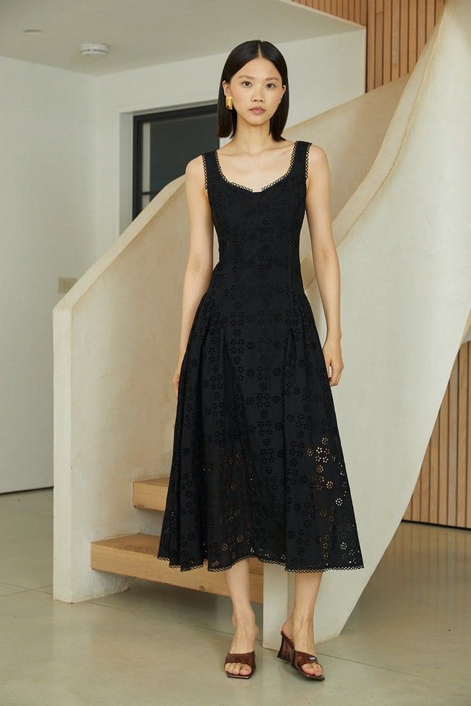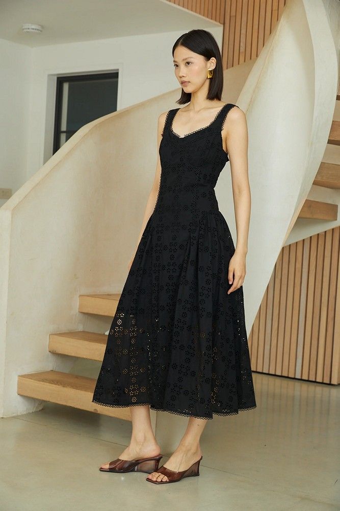 Atemporal y de una elegancia natural, este vestido está confeccionado en 100 % algodón, ofreciendo una sensación transpirable con un acabado de estructura suave. Diseñado en negro clásico, presenta intrincados detalles de bordado inglés que le aportan textura y una sutil sofisticación.