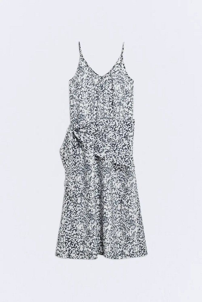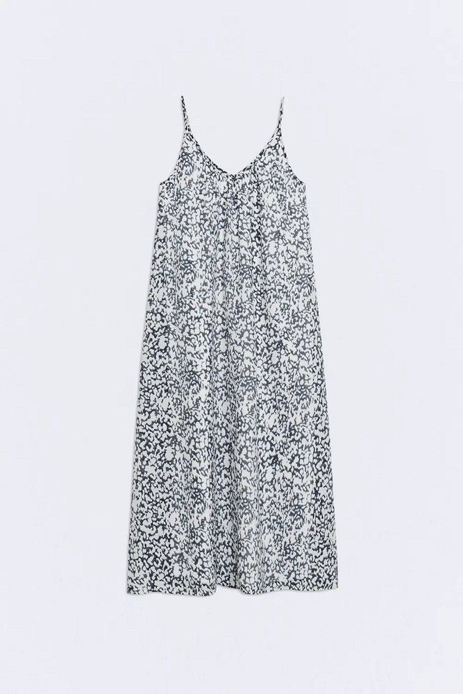 El vestido Zanzibar es una prenda ligera y fluida confeccionada en tejido fino y agradable, fabricado en Italia, con estampado blanco y negro tipo leopard print.
