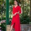 Vestido mujer midi de fiesta asimétrico, con escote cruzado y cinturón.